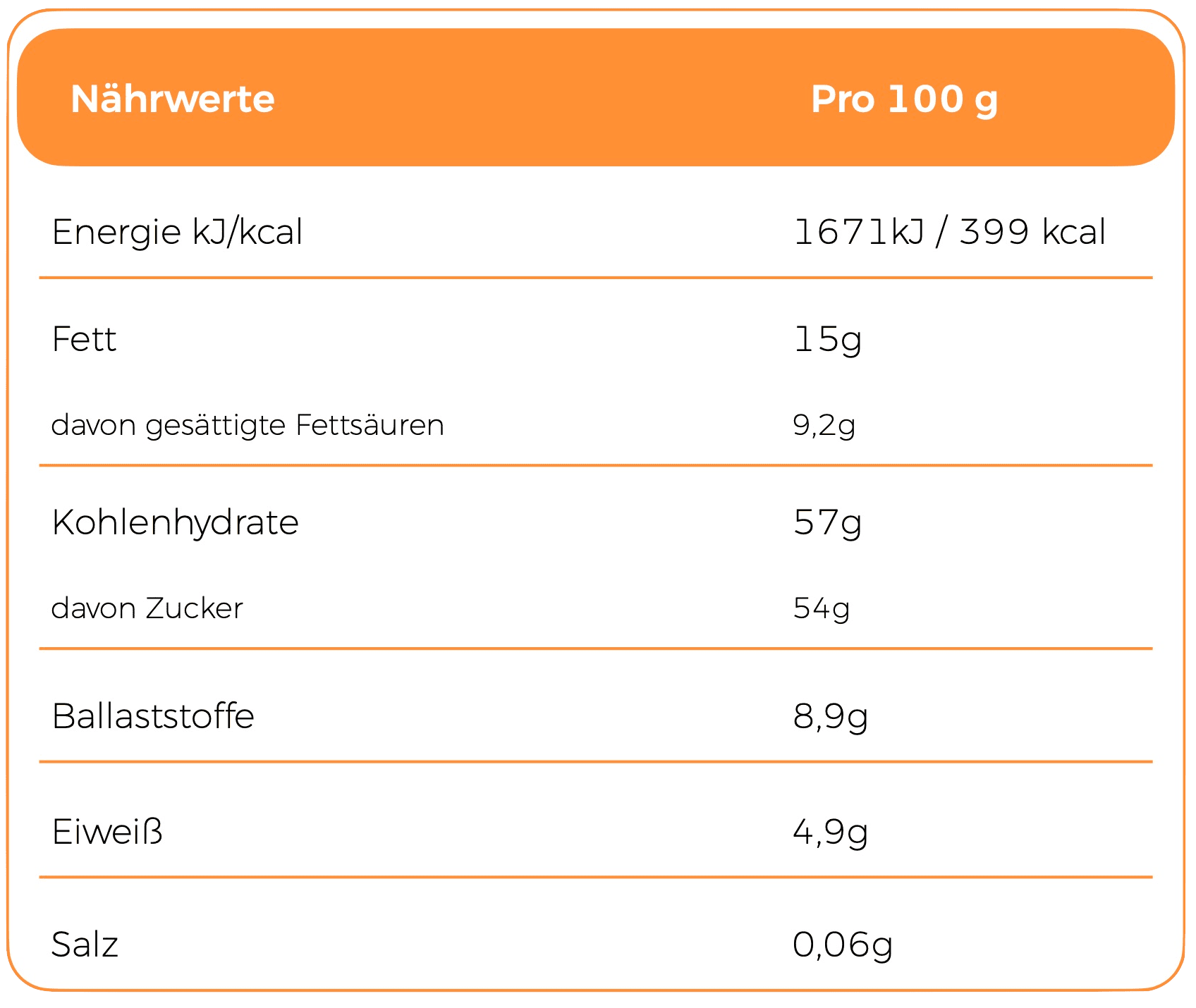 - Kann Spuren von anderen Schalenfrüchten und Sesam enthalten.